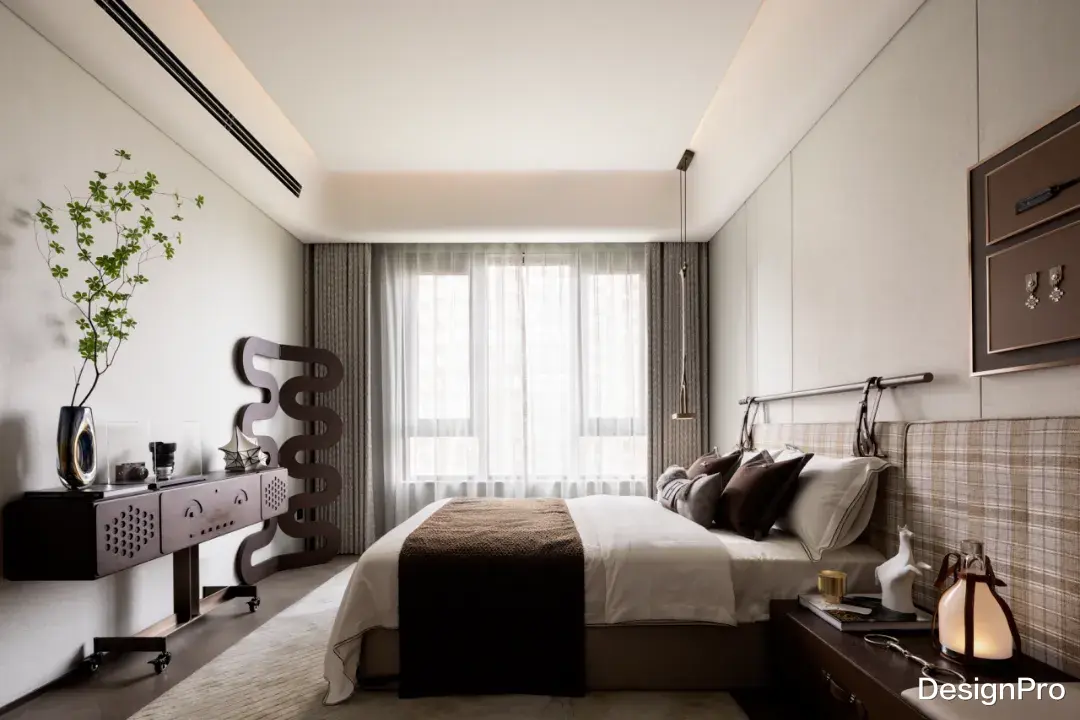 另一间卧室则坚守简约复古的美学秩序,床体向外延伸出长椅,搭配精致简约的茶几,营造出随性亲和的起居环境。