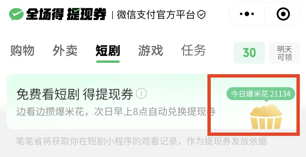 在不用手机的时候,比如中午午休或者晚上睡觉的时候,点开左边的短剧,随便打开一个短剧,放着不动,短剧就会一集接一集的播放,而观看短剧获得的爆米花会在第2天的早上8点自动兑换成提现券,这样每天又可以轻松到账50元左右的额度,当然如果你看的时间长,几百一天也是有的。