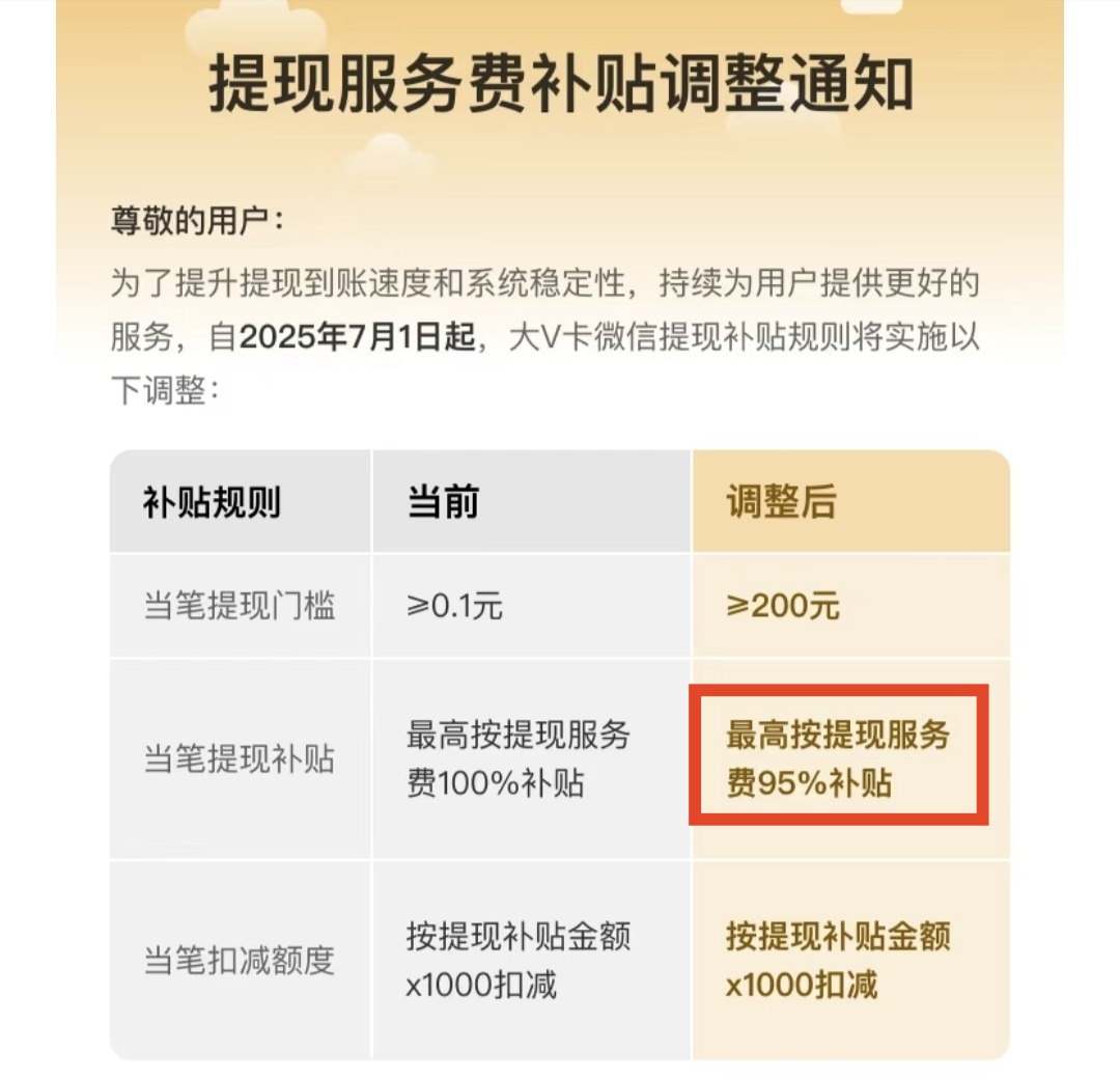 提醒大家的是从2025年7月1日开始,大于200元的提现已经不是全额补贴了,比如提现10000元,手续费10元,补贴手续费的95%,也就是补贴9.5元,自己需要出0.5元的手续费,所以这条给大家放在后面,急需用钱了再提,不急就慢慢提,每天提现大几百,也很快的。所以大家没有腾讯大V卡的可以办一张应急提现用,补贴95%的手续费,总比其他银行卡自己要出全额手续费划算。