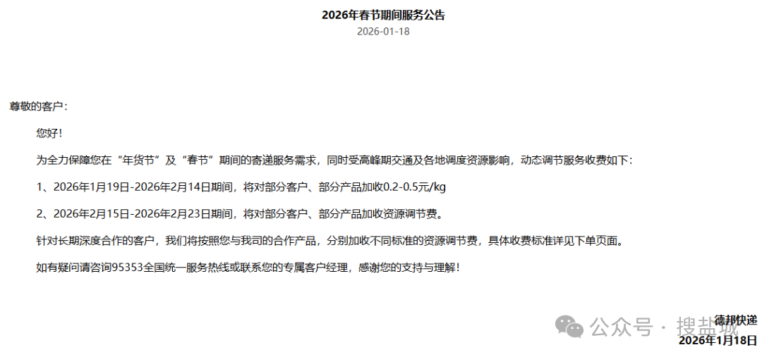 在2026年1月19日—2026年2月23日期间,将在特快重货产品原价格基础上加收0.1—1.2元/kg的高峰期资源调节费。