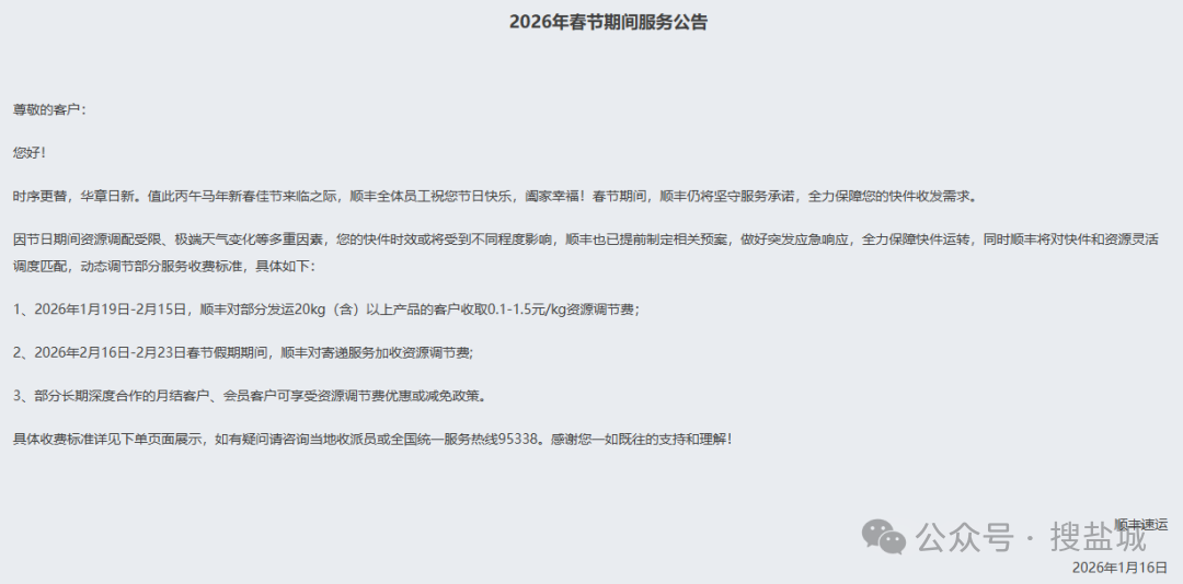 1、2026年1月19日—2月15日,顺丰对部分发运20kg(含)以上产品的客户收取0.1—1.5元/kg资源调节费;