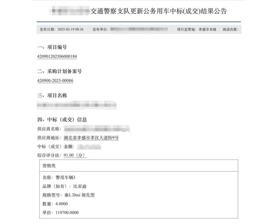 在全国多地政府的实际采购中,比亚迪已成为警车队伍中的“高频面孔”。公开的政府采购公告显示,安徽合肥、辽宁锦州、陕西西安、湖北孝感,再到贵州黔南,多地公安系统的警车采购项目中都出现了比亚迪旗下车型的身影。这些车型覆盖了秦PLUS、宋Pro、宋PLUS等多款主力产品,应用于日常巡逻、刑事侦查等多种执法执勤场景。