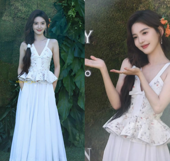 紧随其后的章若楠则像邻家女孩般甜美可人,Giambattista Valli的白色碎花裙配上单侧麻花辫,仿佛刚从海边度假归来的少女,与身后渐渐西沉的太阳构成了一幅绝美画面。