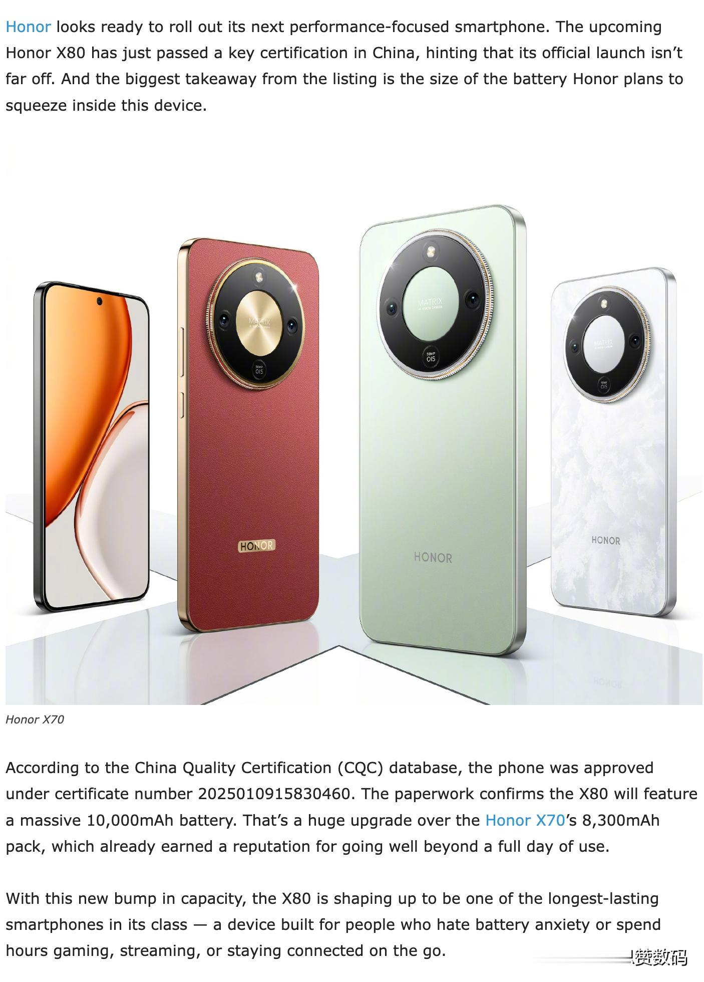 对比一下上一代 Honor X70。八千三百毫安时,已经让它在同级里打疯了。现在 X80 直接暴力提升两千多毫安时……这意思很明显:Honor 是准备把“续航王”这个名号焊死。