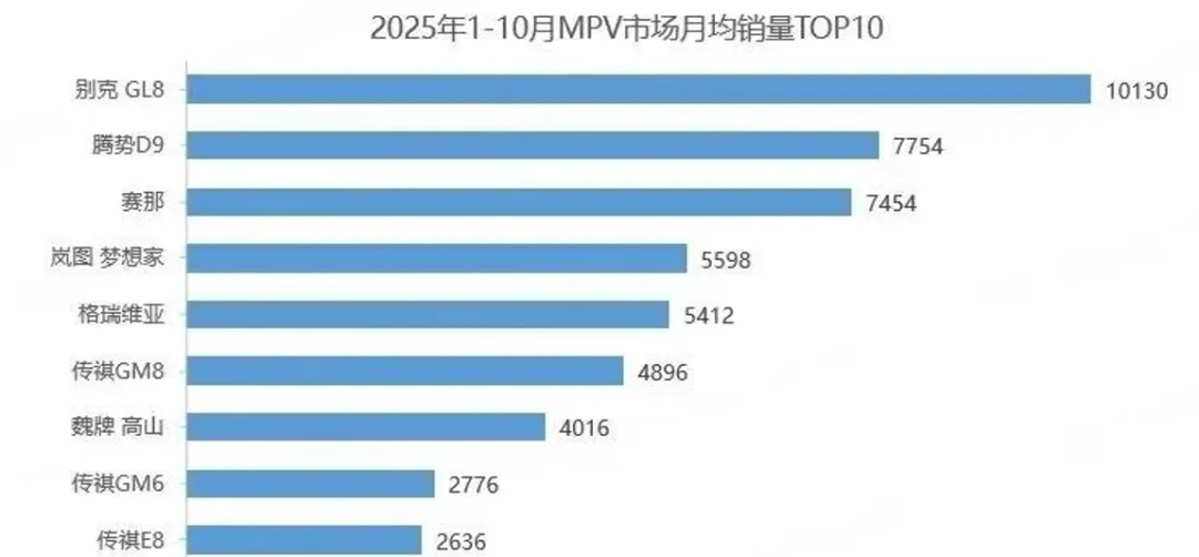 2025年1-10月MPV市场TOP10车型销量占总量的比例约为73.2%,TOP10车型销量中新能源占比为49.4%。月均销量过万的仅有别克GL8。传祺GM8/GM6/E8三款车型合计月均超过10000辆。比亚迪 夏,销量依然没有太大起色。魏牌高山,凭借高山7、8、9系列车型,10月单月销量接近10000辆,单月是TOP1,腾势D9和岚图梦想家的销量表现依旧稳定。