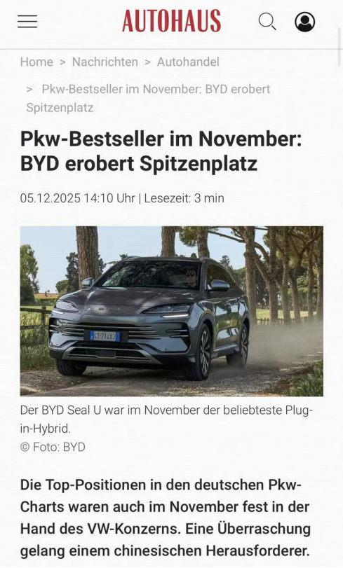 近日,比亚迪旗下车型宋PLUS(当地名BYD SEAL U)在德国市场创下历史性成绩——成为11月插电式混合动力车型销量冠军。这不仅是中国汽车品牌首次在德国主流细分市场登顶,也标志着比亚迪在欧洲市场的规模化突破迈入全新阶段,海外已成为比亚迪新的增长点。