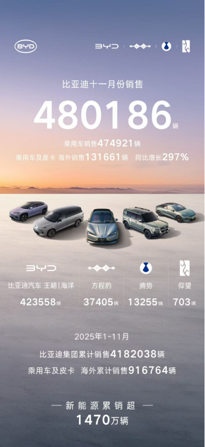 2025年1-11月,比亚迪乘用车及皮卡海外累计销量已突破91万辆,11月单月海外销量达131,661辆,同比增长297%。截至目前,比亚迪全球新能源汽车累计销量已超过1470万辆。