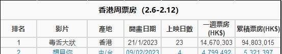 2023年第六周(2.6~2.12)中国香港票房统计: