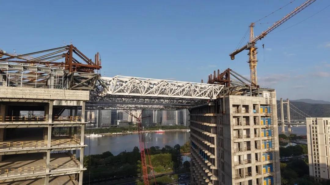 11月25日至26日,历时36个小时,厦航广场项目重达1700吨的钢结构屋盖被稳稳提升至70.3米的高空,并精准安装到位。该屋盖连接着东西两座塔楼,跨度达93.5米,相当于一个足球场长度。
