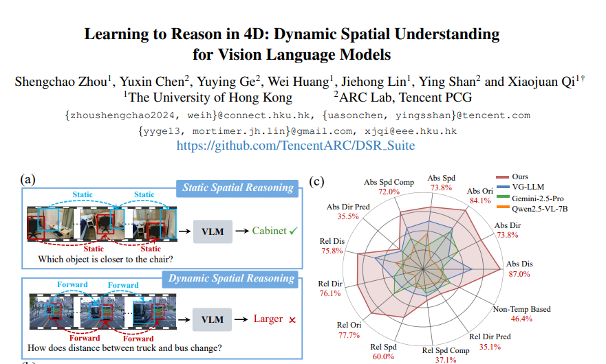 这项由香港大学的周胜超、齐晓娟领导,联合腾讯PCG ARC实验室的陈宇鑫、葛育英等研究者完成的研究,发表于2025年12月的arXiv预印本平台,论文编号为arXiv:2512.20557v1。研究团队针对当前视觉语言模型在理解动态场景中物体空间关系变化方面的不足,开发了一套名为DSR Suite的完整框架,让AI能够像人类一样理解和推理三维空间中物体随时间的运动变化。