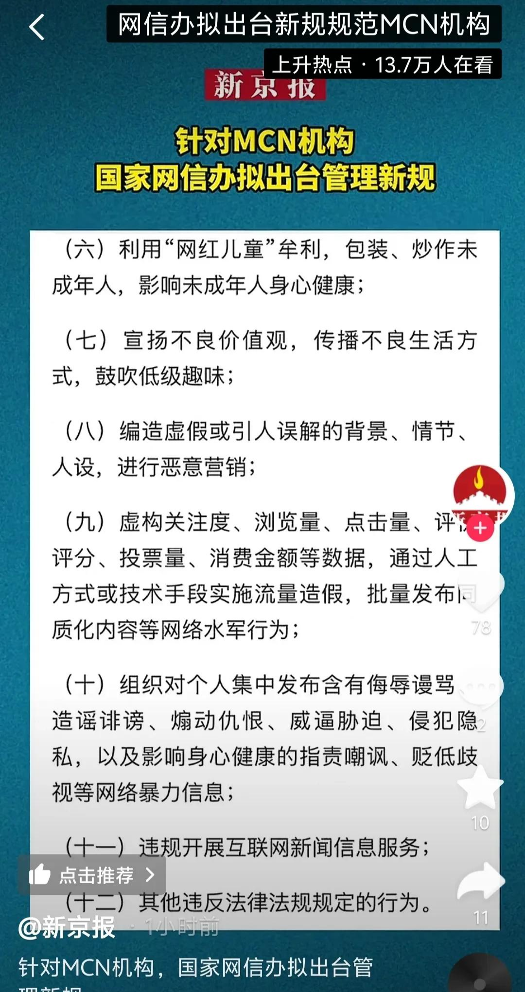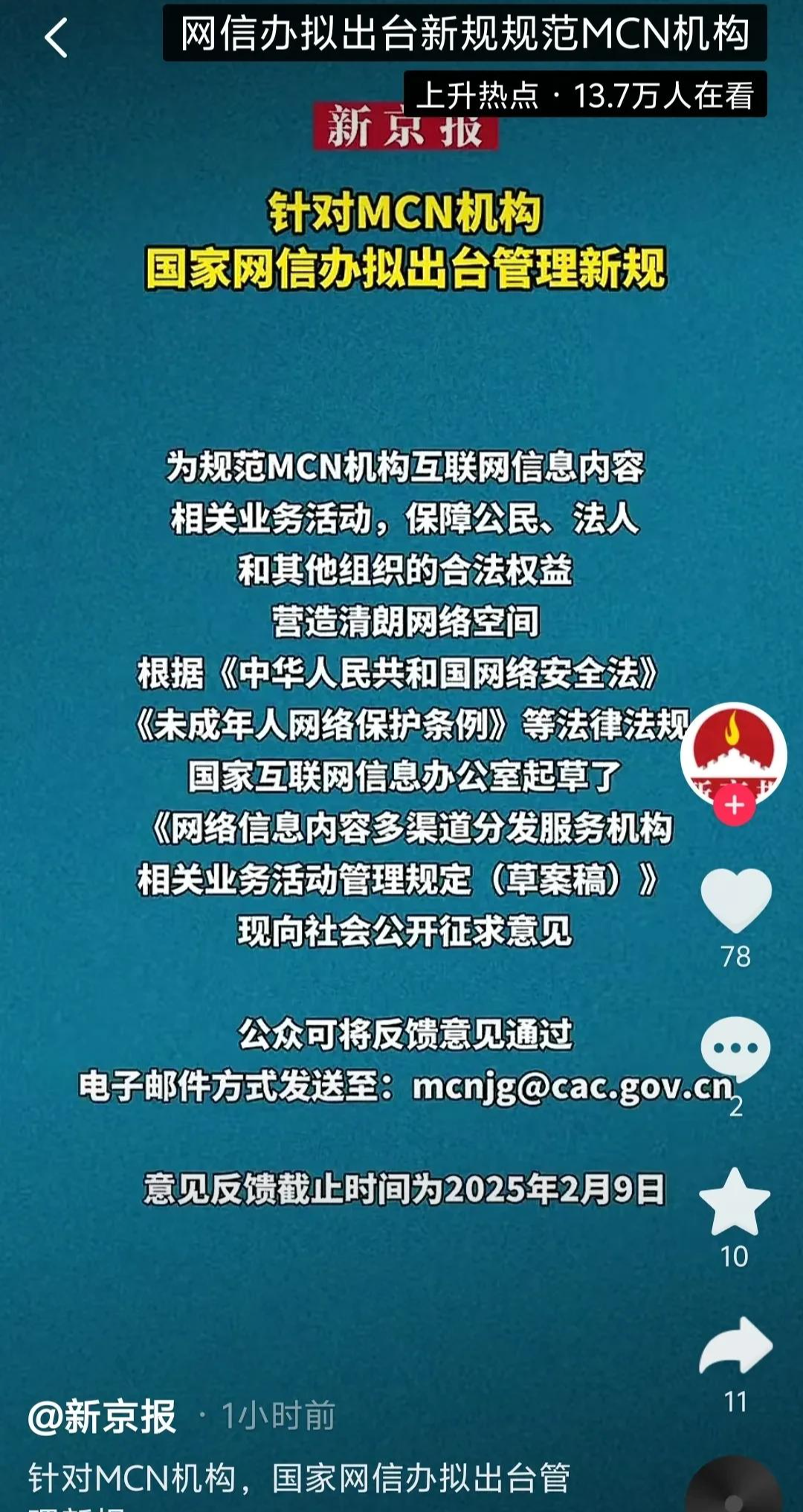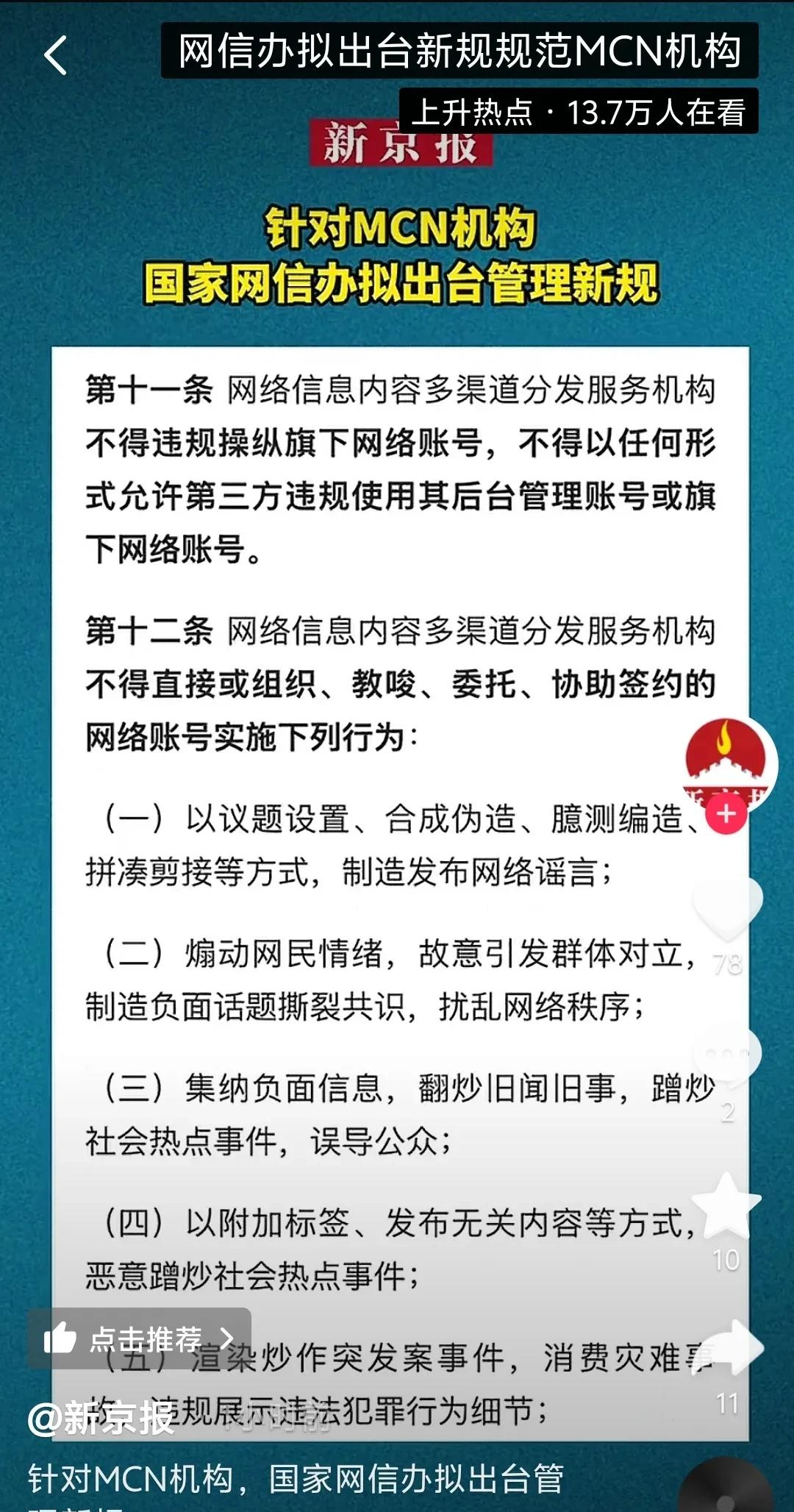 1月10日,国家网信办起草了《网络信息内容多渠道分发服务机构相关业务活动管理规定(草案稿)》,向社会公开征求意见。这利好广大个体创作者,因为平台生态更规范了!