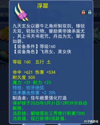 前不久,有名老哥在鉴定160级武器时鸿运当头,收获了逆天双蓝字。这是附带伯牙绝弦特技和法暴伤害2.2%的双剑,特技效果是降低对手单体10%法伤属性,属于PK必带小特技之一了。而它的基础伤害为534且附加54点魔耐属性,总共给佩戴者提供159点法伤。