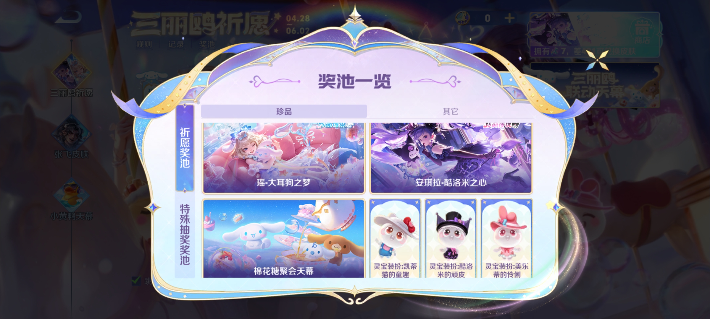 王者荣耀三丽鸥的祈愿活动已经开启,这次活动和以往的规则有些不同,其中最大的区别就是个性天幕和两款珍品传说放在同一个活动奖池中了,意味着这两个奖品要共享赠送次数,赠送最大上限为2次,这一点大家要格外注意。
