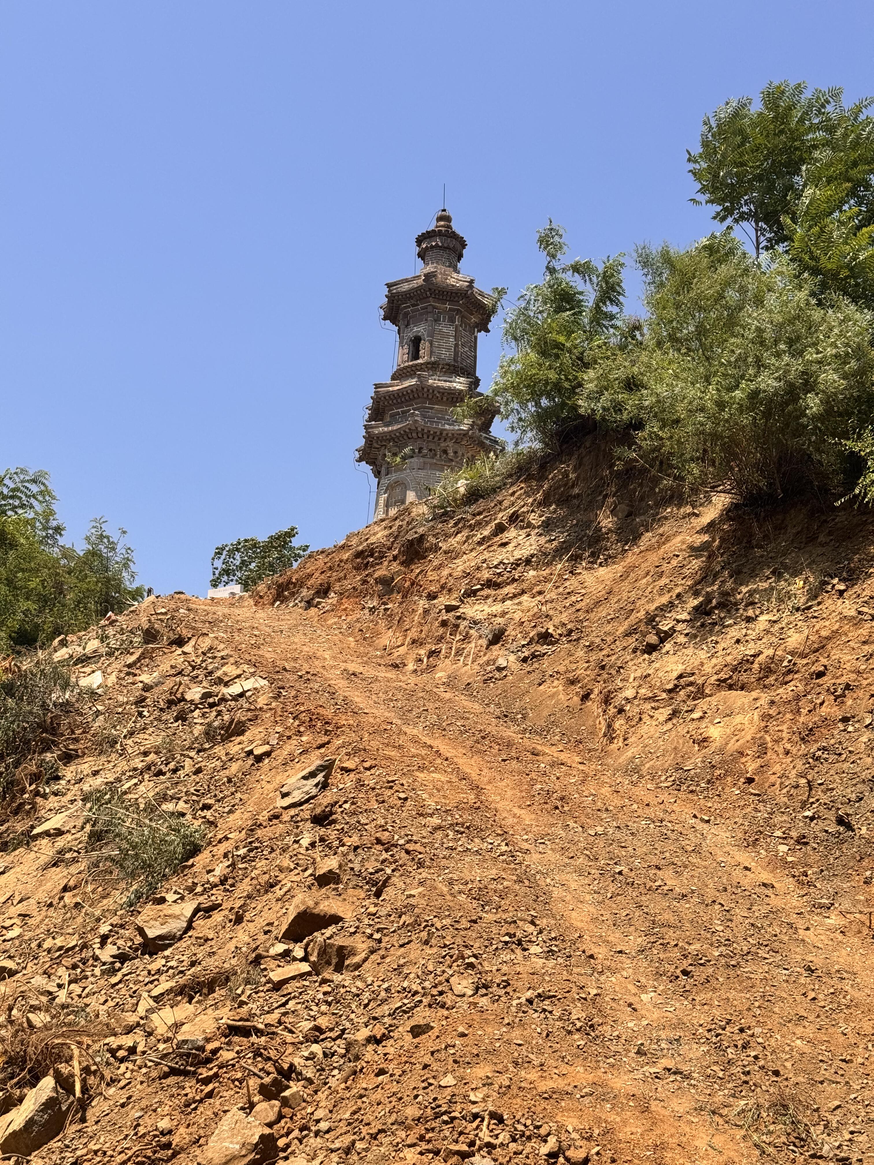 踩着碎石土路往上爬,鞋底不时打滑。路两旁的桃树挂着沉甸甸的果实,每个都套着艳红的纸袋,像穿了嫁衣的姑娘。当地老人说这是防虫的法子,可在我眼里,这些晃动的红袋子倒像是某种神秘的仪式标记,指引着访客走向辽代的时空入口。半山腰的风裹着栗子花的气息扑面而来,那种混合着潮湿与木质的味道,浓烈得近乎霸道,和这座低调的古塔形成奇妙的反差。