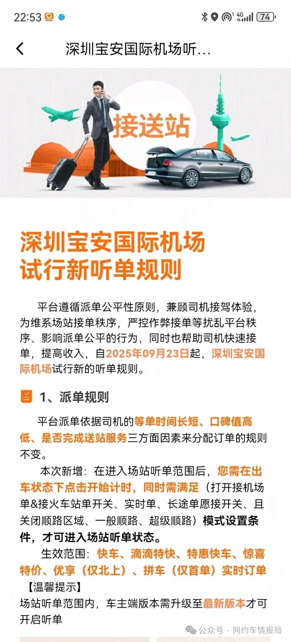 注意,滴滴机场派单规则大更新,用科技的,甩定位、托管的司机们要开始考虑扫街了,去机场的司机师傅们,记得调整接单习惯,人人都有机会接大单!据车友爆料,9月23日起,深圳宝安机场将实施新的听单规则,在保留综合考虑司机等单时长、口碑值高低、是否完成送站服务等三方面因素外,新规则新增了计时听单功能。