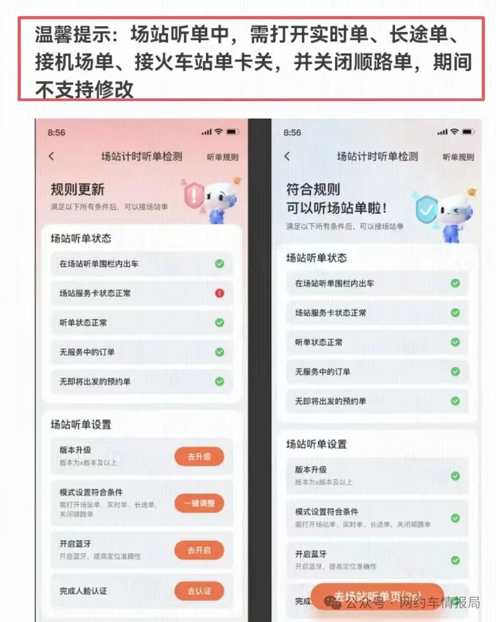 司机进入机场听单范围,打开计时功能进入听单状态前,必须先要打开实时单、长途单、接机场单、接火车站单卡关,并关闭顺路单,期间不支持修改。