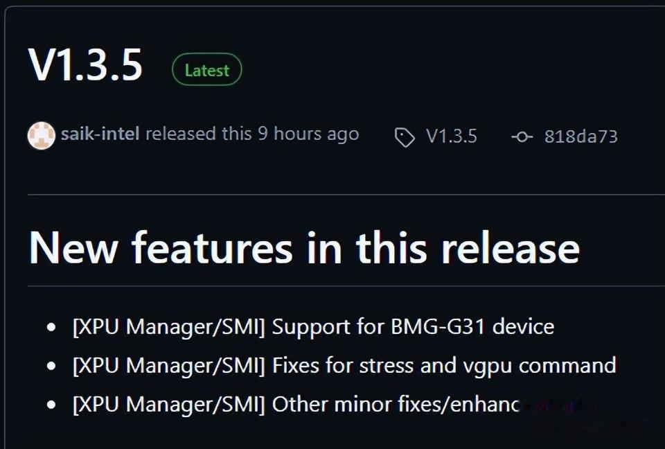 据爆料,Intel XPU Manager 1.3.5已明确加入对“BMG-G31”的支持,这是又一个软件层面的信号,表明更大的“Big Battlemage” 核心正在积极开发与驱动调试中。厂商通常不会为不存在的硬件添加设备ID,因此这种出现在官方工具包里的条目可信度极高。