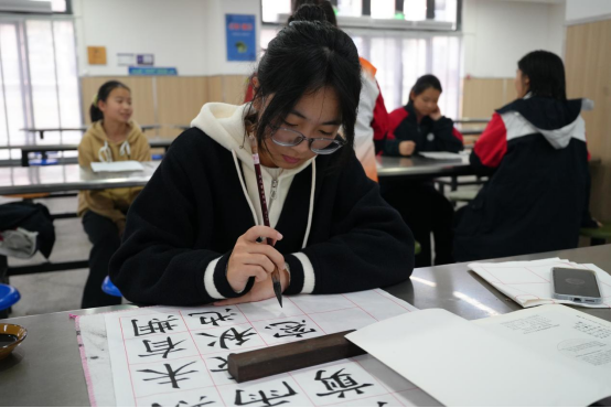 比赛现场,同学们专注书写,楷、行、隶诸体皆备,笔墨间既呈现《论语》、《道德经》等经典文句,也融入校训与时代语句,展现了对传统文化的传承。部分作品巧妙融合书画意象,通过字形与图景的结合,体现出极强的创造力。评委从笔法、结构、创意与内涵多角度评审,兼顾功底与创新。活动不仅是书法技艺的展示,更是一次生动的文化实践,体现了学校“五育并举”的育人理念。作为校园艺术节的重要组成部分,大赛持续营造翰墨氛围,优秀作品将于文化长廊展出,让书法艺术在校园中持续浸润人心。