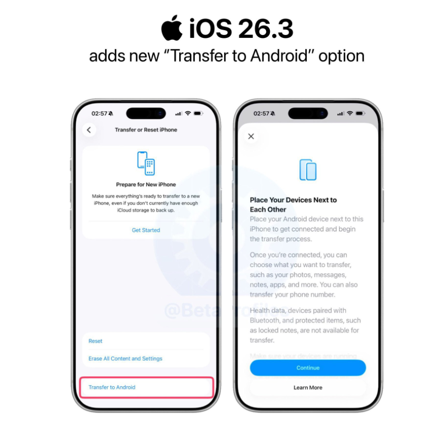 值得注意的是,iOS 26.3引入了全新的“传输至安卓”功能,用户只需将iPhone与安卓设备靠近,即可启动数据传输流程,无需下载和使用第三方应用。