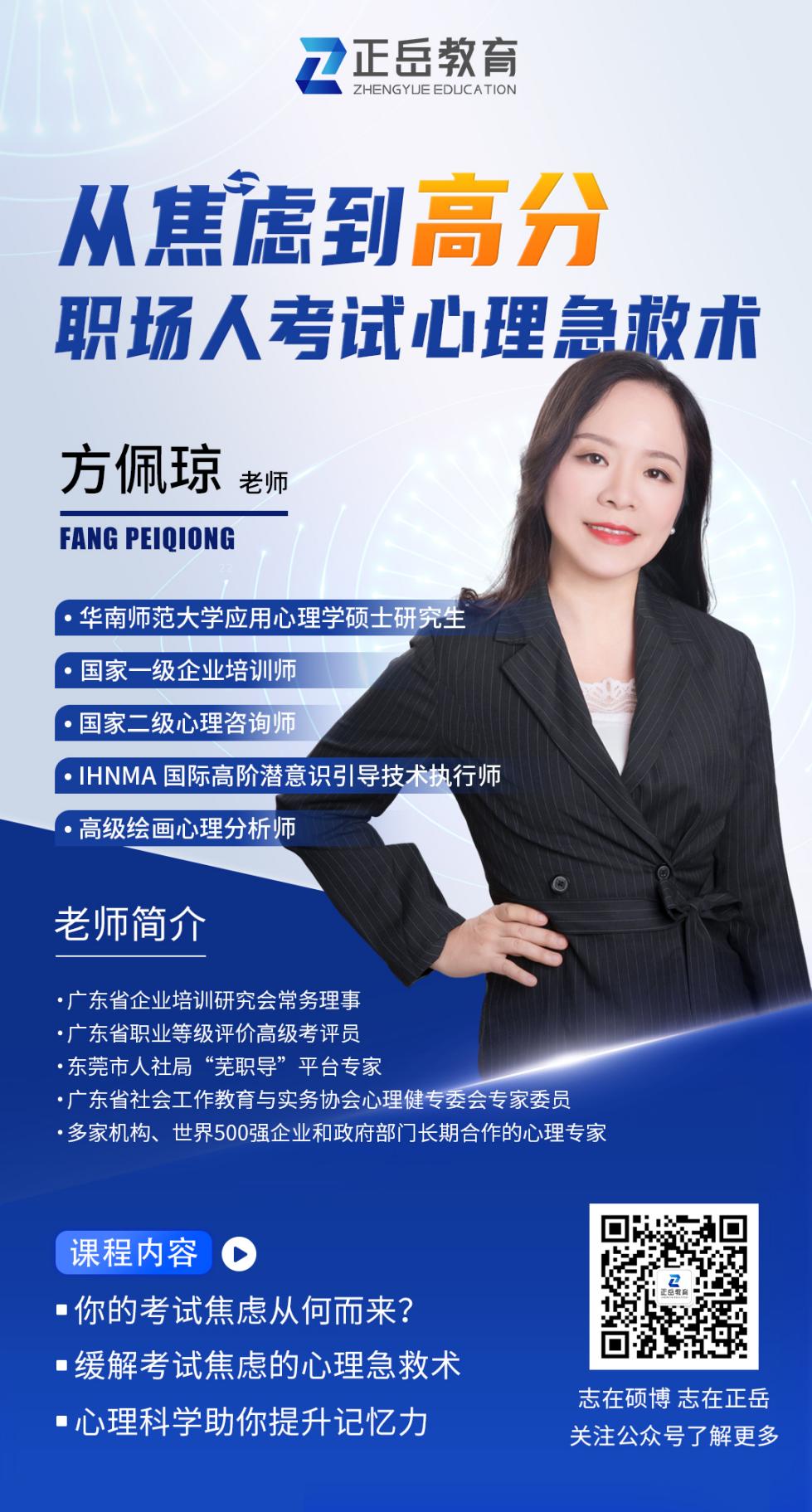 正是洞察到这一考前焦虑现象,正岳教育在持续提供精准、系统学科辅导的同时,决定在冲刺的紧要关头为学子们送上另一份至关重要的支持。正岳教育于12月11日特邀华南师范大学应用心理学方佩琼老师,开设一堂专为考研人定制的《从焦虑到高分:考前心理急救术》主题直播课。这标志着正岳教育的服务理念从专注于“知识提升”,进一步拓展至“心理赋能”,致力于在最后阶段为学员构筑坚实的综合应考能力。