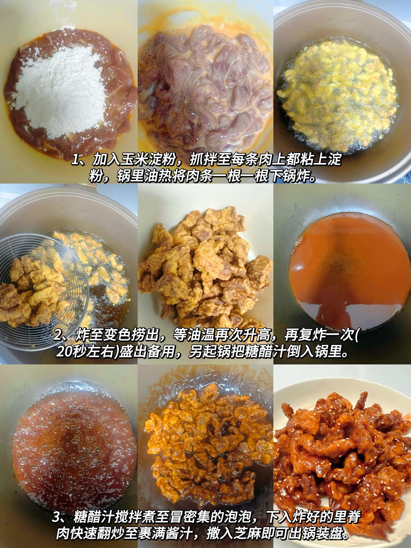 裹粉和炸制是决定这道菜成败的“临门一脚”。在腌好的肉条中加入足量的玉米淀粉,抓拌至每根肉条都均匀地裹上一层薄薄的淀粉糊。锅中倒油,油温烧至六成热时,将肉条一根根地下锅炸制,避免它们粘连在一起。炸至肉条表面金黄、微微浮起时,先捞出控油。等油温再次升高后,进行关键的“复炸”步骤,将肉条再次下锅炸20秒左右。这一步能让肉条的外壳变得更加酥脆,即使裹上酱汁也不容易变软。