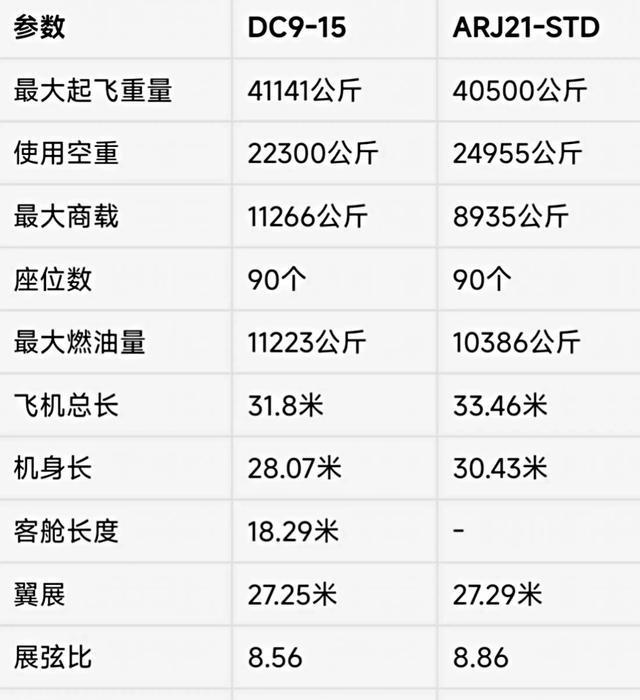 ARJ21客机最大起飞重量约40.5吨,DC-9-15则为41吨。两者最大燃油量有所不同,前者为10.3吨,后者达到11.2吨。