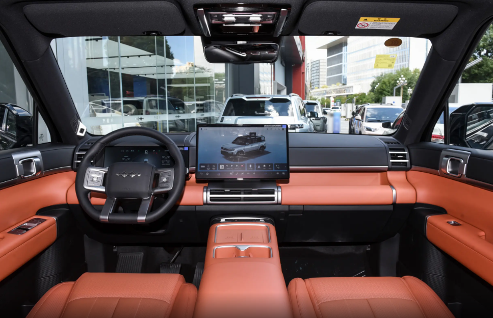 接下来,我们再进入前排,中控台的布局设计同样粗犷中透露着精致,撞色内饰营造了一个温馨的乘车空间,全系标配15.6英寸中控屏、10.25英寸液晶仪表盘和26英寸HUD抬头显示。支持两种手机互联系统,对于华为用户来说更为友好,与手机展开互联之后可以解锁更多功能,大部分多媒体功能都能通过语音助手控制。从次低配开始便配备了车载冰箱,温度调节范围在零下6度到50度之间,像50W手机无线充电这样的配置也不缺。