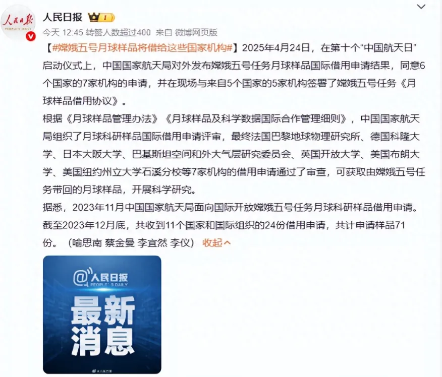 这也让我想到了一件事情,此前我国就公开说明过,我国已经准备了嫦娥五号月壤给美国,让美国拿阿波罗月壤计划来进行交换,结果美国没有回应,而我国这一次直接宣布了,美国入选名单,让很多人误会了,中国已经给了,这报道至少说明了,还没有给,要想拿到,必须与中国签署协议。