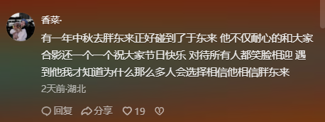 有一年中秋去胖东来正好碰到了于东来 他不仅耐心的和大家合影还一个一个祝大家节日快乐 对待所有人都笑脸相迎 遇到他我才知道为什么那么多人会选择相信他相信胖东来