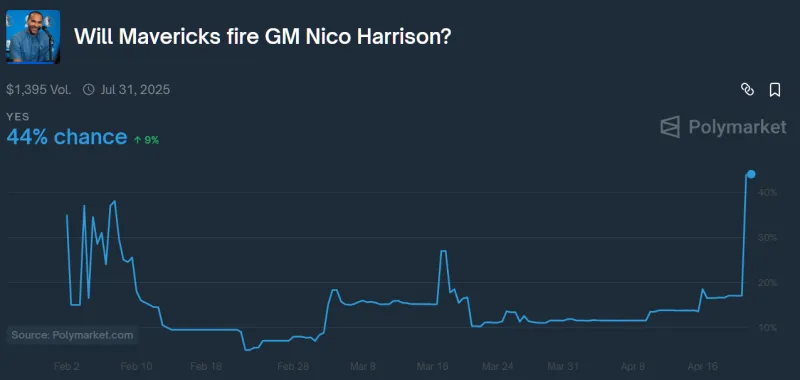 然而,发布会后的形势却发生了巨大转变。根据预测平台 PolymarketSport 显示的数据,在当天的新闻发布会后,尼科 - 哈里森被解雇的概率如火箭般蹿升。从图表中可以清晰地看到,在东契奇交易案发生后的几天里,用户普遍认为哈里森被解雇的概率一度高达 35%至 38%。随后几个月内,这一概率逐渐降低至 10%至 20%,并在发布会前稳定在 17%左右。但发布会结束后,这一概率迅速攀升至 44%,预示着哈里森未来被解雇的前景。