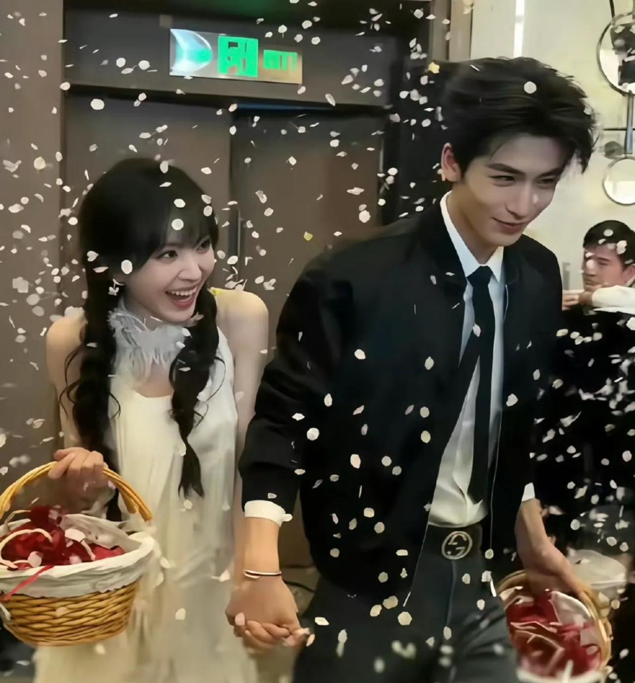 场景更是用心到细节里!照片以柔和逆光为基底,漫天飘落的白花瓣搭配柔焦光影,风一吹,头纱轻轻飘动,每一张都像电影截图,没有过度的亲密肢体接触,仅靠眼神交汇的默契、自然贴近的距离,就把成年人的缱绻情愫,传递得淋漓尽致。粉丝们特意给这组照片取名“通天路婚礼现场”,刚好呼应《逐玉》里的经典台词,把剧粉的情怀狠狠拿捏住了。