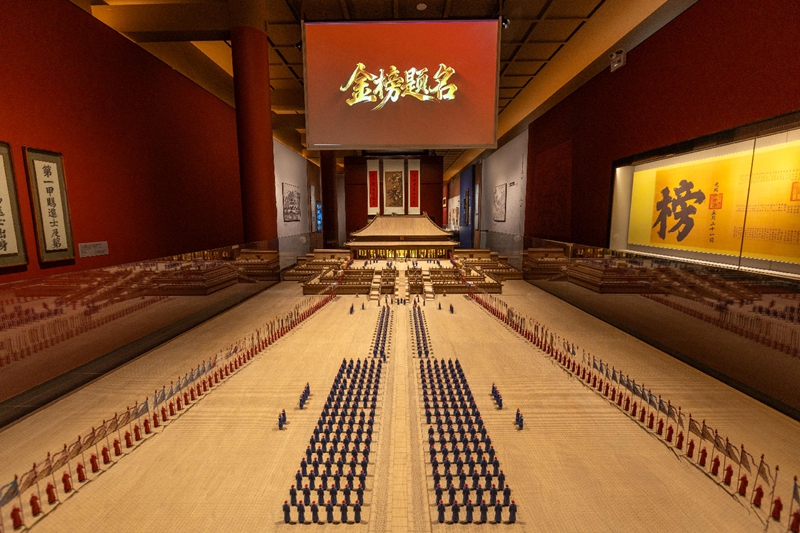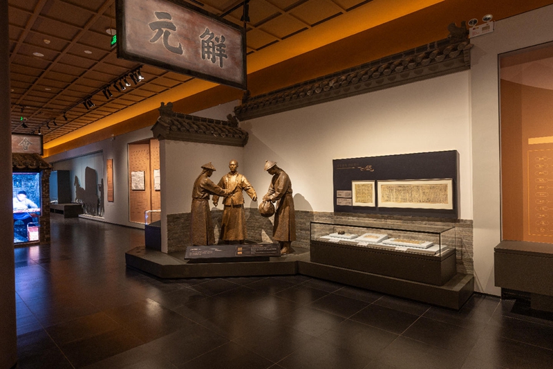 第二部分“杏园征途”展示科举士子们十年寒窗的奋斗历程。展览以清代科举流程为样本,通过童试、乡试、会试、殿试四级考选场景复原,带领观众穿越时空体验“十年寒窗——四级考试——一朝功名”的士子人生,生动再现了古代士子从童生到进士的艰辛历程与辉煌成就。观众可在此感受古代士子的生活状态与精神风貌,领略科举制度对个人命运与社会发展的深远影响。