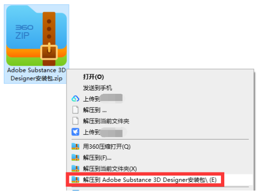 安装步骤:1、得到压缩包之后,鼠标右键解压,点击【解压到Adobe Substance3DDesigner安装包】。