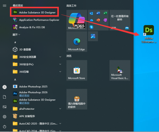 8、点击电脑桌面左下角开始按钮,找到刚刚安装的Adobe Substance 3D Designer软件,鼠标左键按住不放拖拽到电脑桌面。