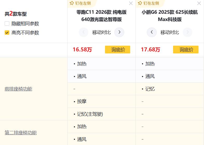 首先是小鹏G6,这款车的外观我其实挺喜欢的,续航625km也跟零跑C11差不多。但就是价格有点太高了,入门版就要17万多,并且坐起来没有零跑C11舒服,比如它的前排少了按摩功能,后排也没有通风和加热,所以就放弃了。