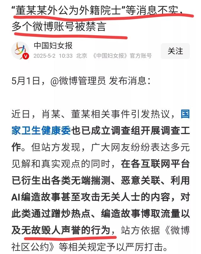 中国妇女报5月2日头条发文如下首先妇女报为董小姐辟谣:董某某外公为外籍院士等为不实消息,微博三个账号被封禁,大家不要造谣传谣,不要诋毁别人声誉。
