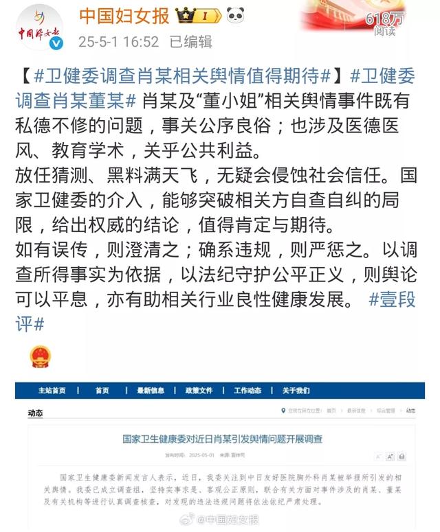 国家卫生委员会已经成立调查组调查肖某和董小姐的事情,期待尽快发布结果。