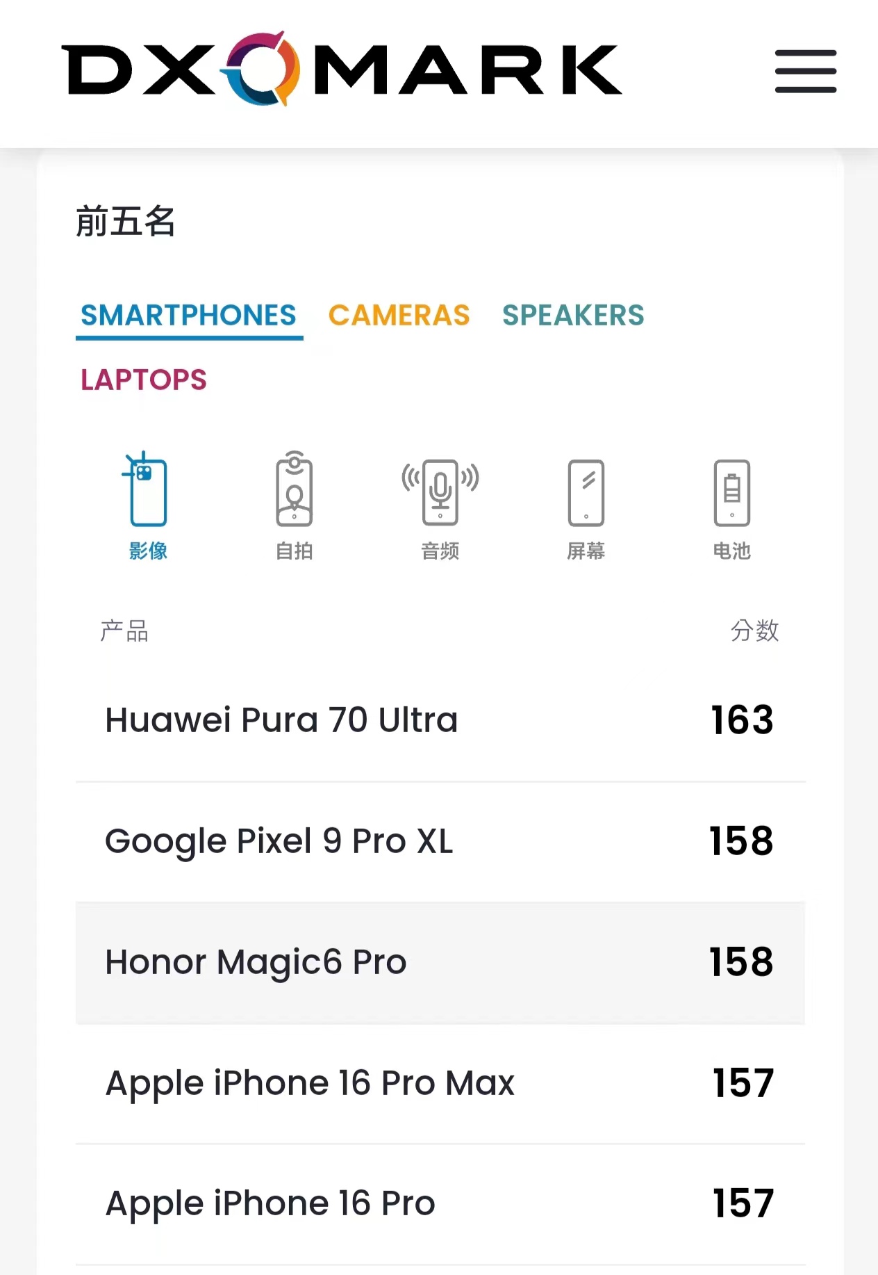 截至目前最新的DXO评测中,华为 Pura 70 Ultra为冠军,总分达到了破纪录的163分。