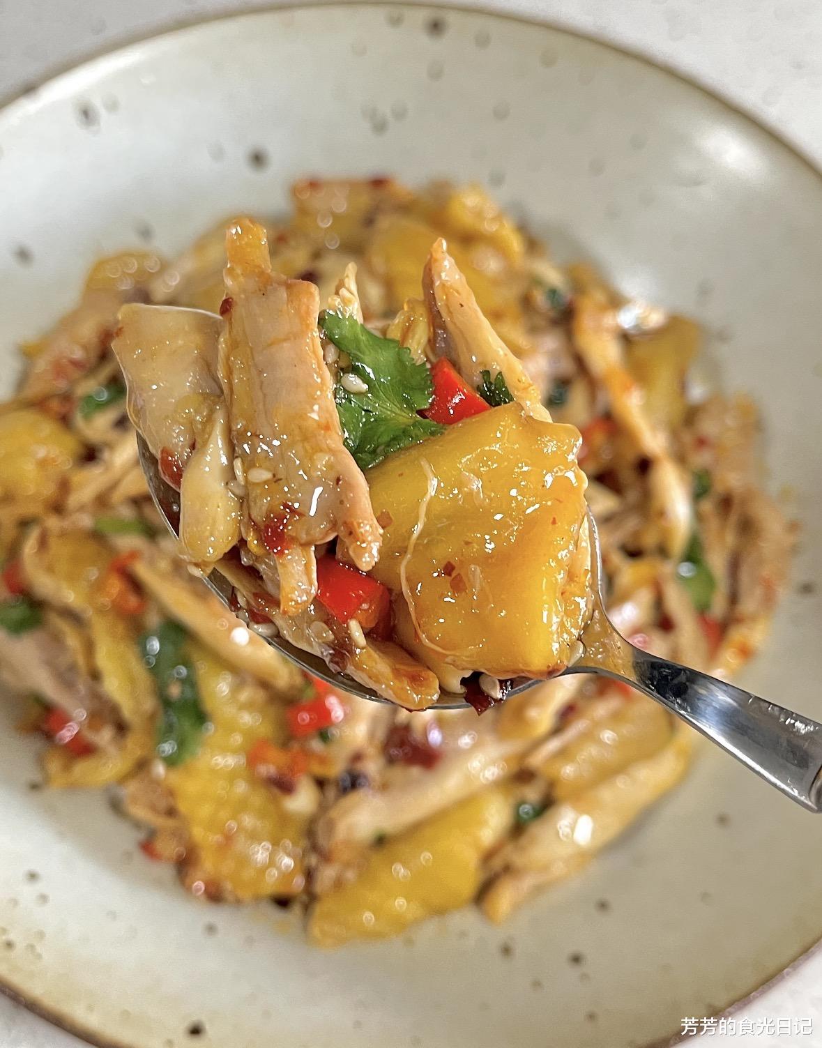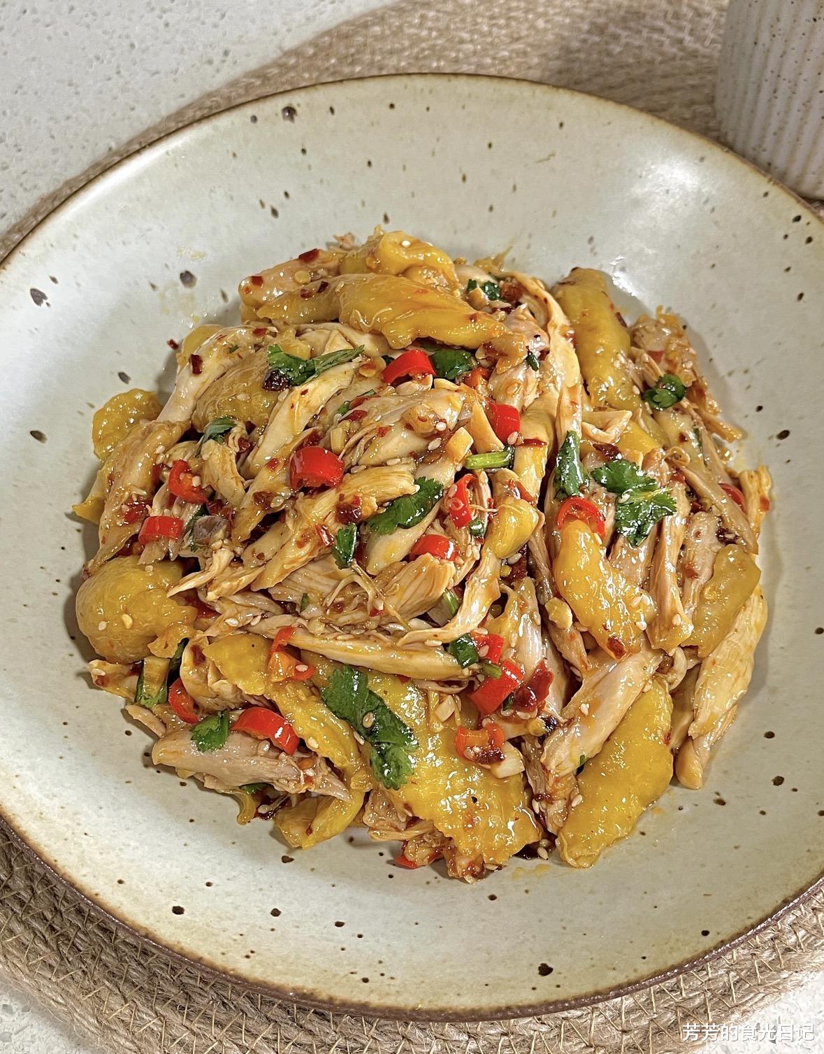 接下来,就是手撕鸡的关键步骤——撕肉。将冷却后的鸡肉放在案板上,用手轻轻撕成细丝。这个过程需要耐心,每一条肉丝都要撕得均匀,这样才能保证最后的口感。撕好的鸡肉丝放在盘子里,看起来就让人食欲大增。