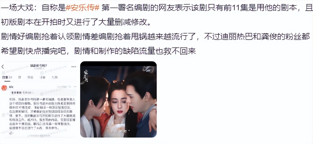 因为剧本过差,没必要的戏份太多,观众不认识的生面孔不要钱地塞,《安乐传》的编剧之间也开始干起甩锅老本行——“前十几集我写的,后面可跟我没关系啊”这走向眼熟吗,去年的《苍兰诀》大烂尾也是这招,你们是招不在新管用就行是吧?
