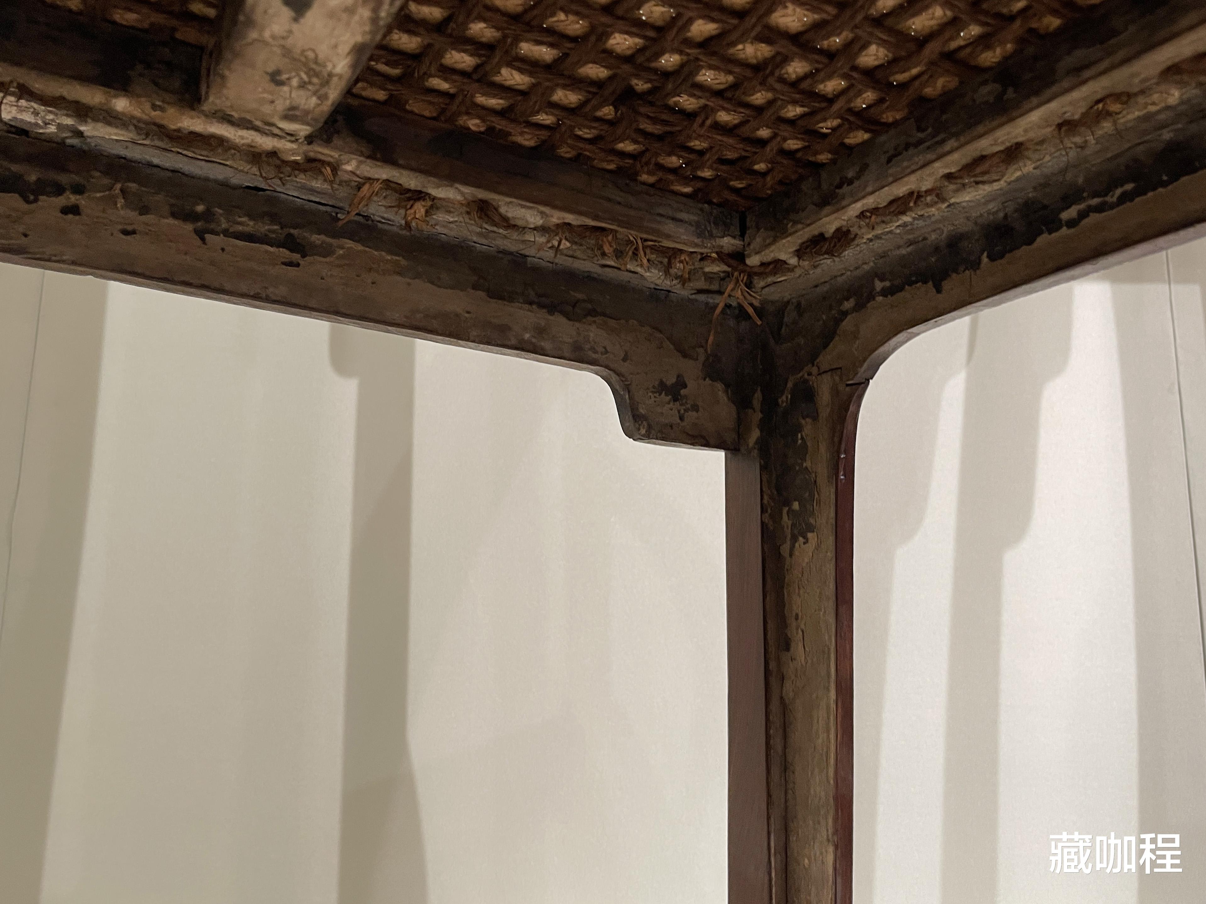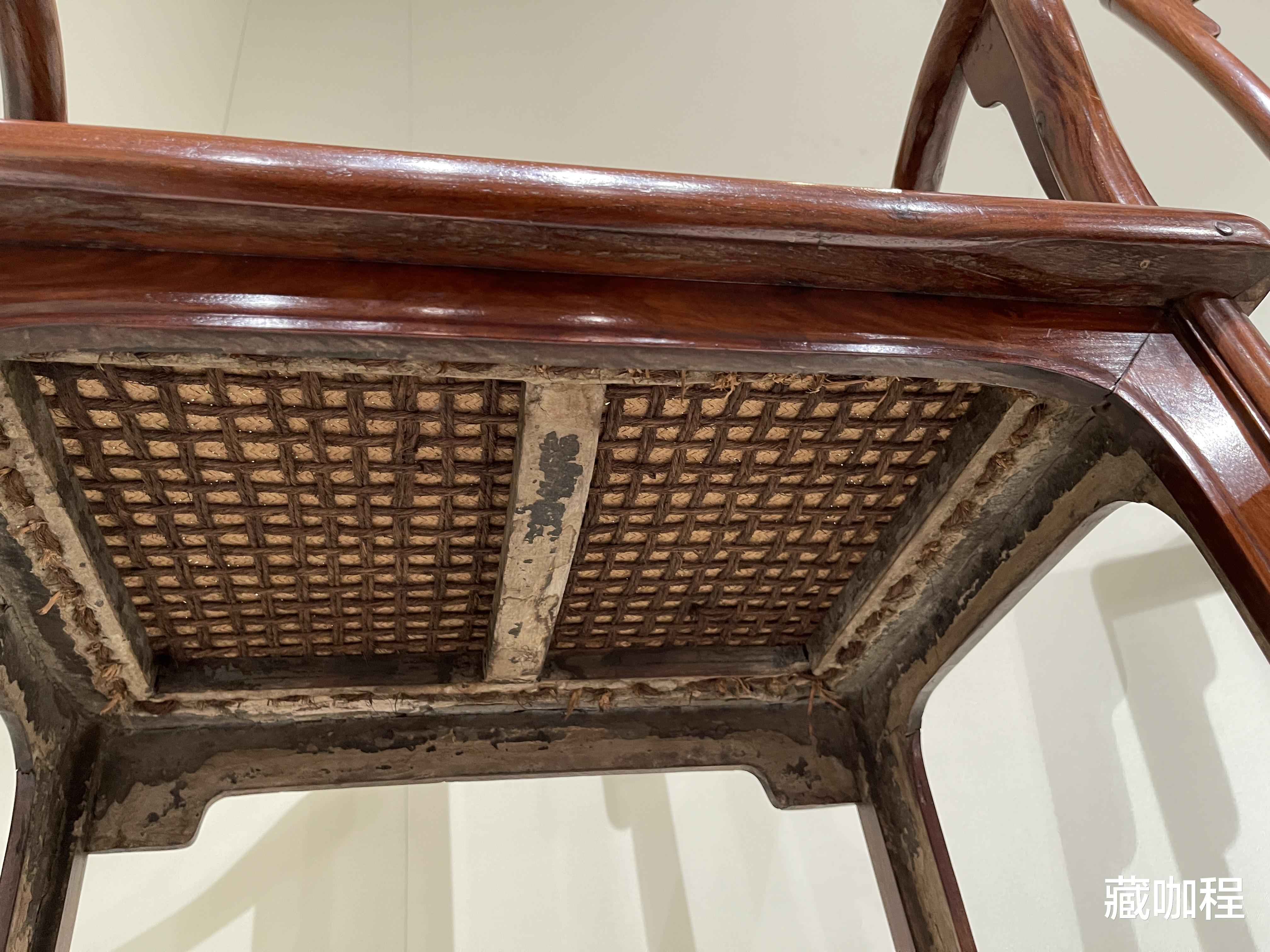 顺着后腿向上望,座面软屉构造完好,底部装弯带一条,棕绳新穿,藤席面后配,各构件表面覆盖着统一的漆底。