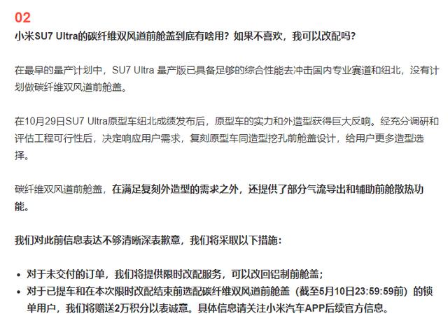 ,我们不得不关注到,除了动力锁定的问题,小米SU7 Ultra的设计也引起了外界的争议。车型的“挖孔版”前舱盖的设计在发布时备受瞩目,但不少消费者对这个设计提出了疑问。小米汽车不得不再次出面解释,称其使用的碳纤维双风道前舱盖不仅仅是满足外观的需求,还具备一定的气流导出与辅助散热功能。网友对这一解释并不买账,许多人依旧表示,产品定位与实际体验之间的差距让他们感到失望。小米汽车在此背景下决定为受影响的消费者提供两万元积分作为补偿,以表达对车主的不满的重视。