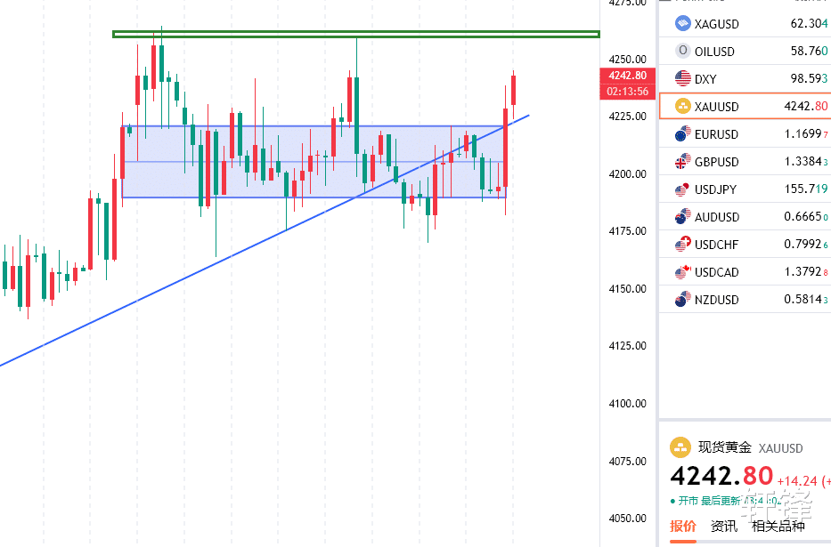 隔夜美联储新一轮利率决议如期落地,符合市场预期降息降息25个基点,但是同时也表达了对目前就业市场以及通胀的担忧,并且强调关税对通胀的影响是一次性的,但是特朗普表达了对本次降息的不满,认为可以继续加大幅度,所以整体本次降息并不是如市场预期那般鹰派,最终市场表现美元指数走弱,黄金得以支撑走高,梳理一下昨天晚间的走势,在数据公布前,黄金维持4190/4205区间窄幅震荡,数据公布后先是迅速拉高到4219附近然后快速杀跌到4181附近然后再度拉高,最高触及4238回落4220附近企稳早盘二次拉高目前触及4245附近,日内4220是个关键分水岭,我们昨天晚间跟大家分享的思路,4184附近多,然后4216附近空,4225破位多均成功兑现到目标位,堪称完美的思路,日内的话关注4220附近分水岭支撑做多,关注4256/60附近压力触及可空!