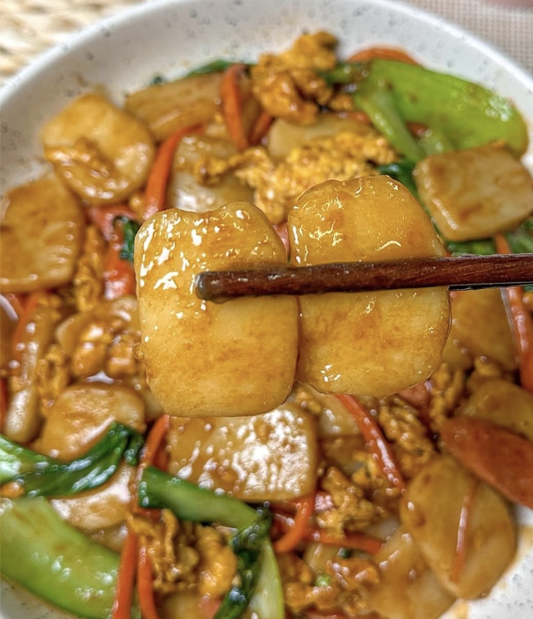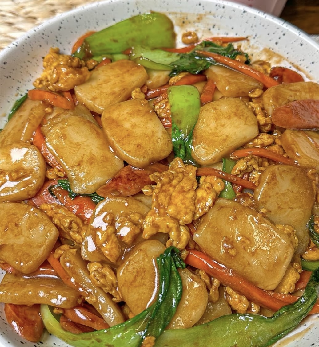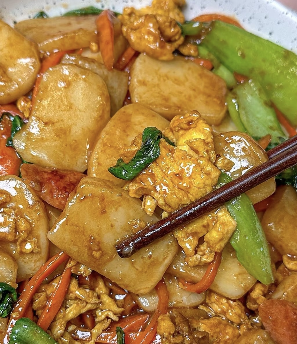 8. 继续翻炒至青菜变软,年糕片完全熟透,即可出锅。