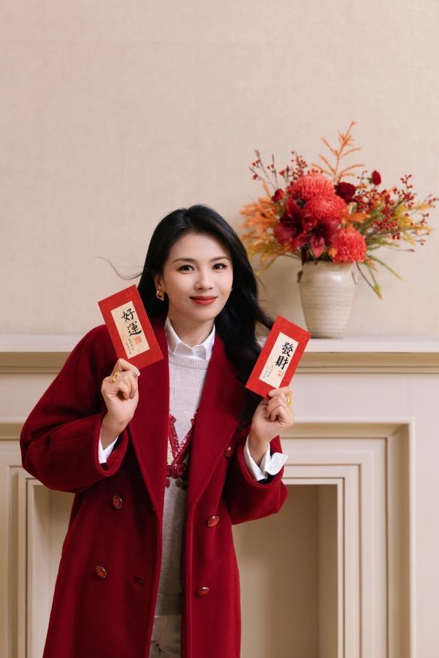46岁的她,留着一头温柔的长波浪,黑棕色的中长格子外套更加显得她温婉大气。