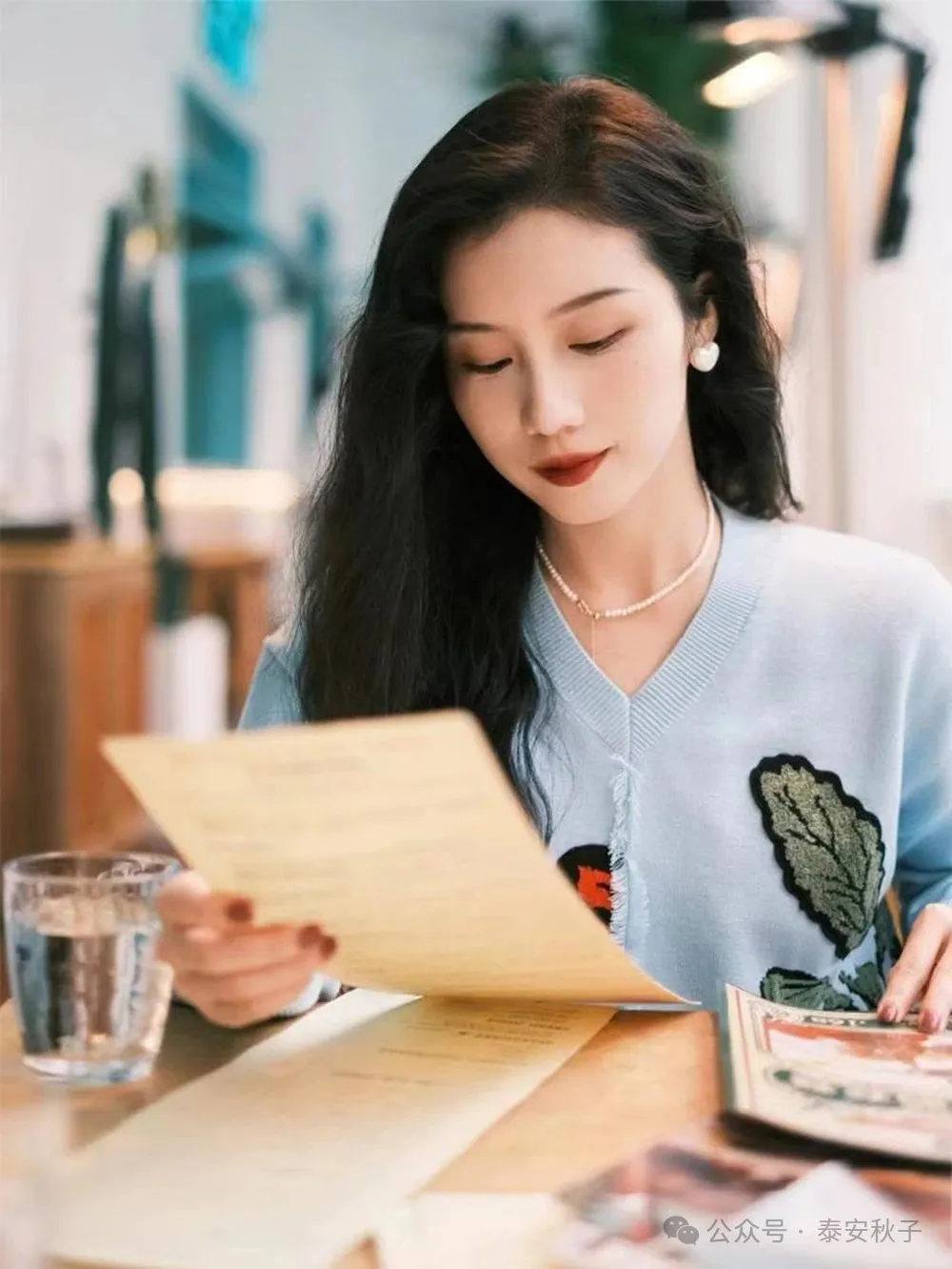 水蓝色开衫的领口,戴条简简单单的珍珠项链,留点空白反而显得更高级;