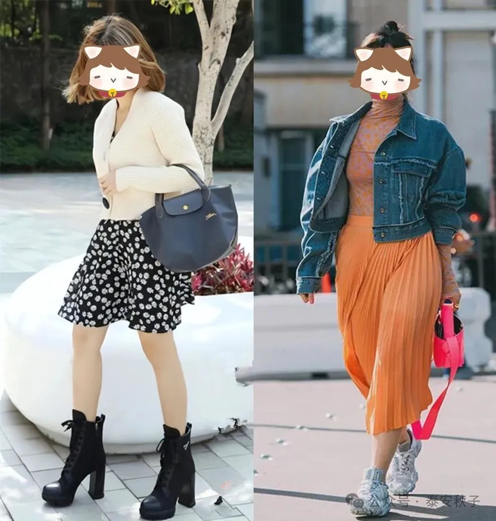 如超长、飘逸的半身裙,与老爹鞋组合在一起,不仅显矮,还会显得拖沓累赘;而让短裙与粗跟马丁靴相配,也同样不协调,整体画风违和,容易显得土气十足。