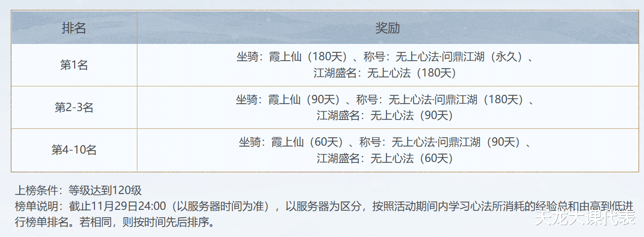 3.心法榜:截至11月29日,按单服心法消耗经验从高到低,从先到后排序。有限时坐骑:霞上仙和永久称号:无上心法·问鼎江湖以及盛名。