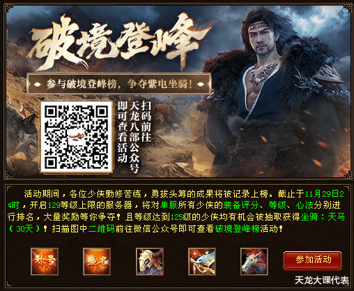 31号新版本今早已经更新完毕,为此官方也开了一个120等级的夺榜活动。活动的榜单是单服排名,仅限129等级上限的服务器。主要奖励为前10名能拿的坐骑和称号盛名。