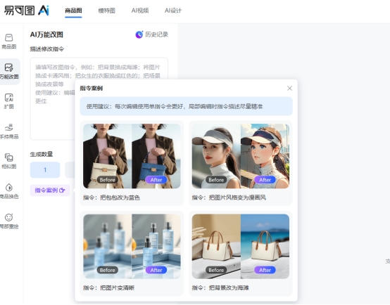 与纯文本生成不同,易可图的 AI 万能改图 更侧重于对现有图片素材进行智能修改。例如: